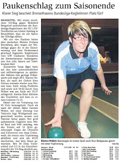 Auf der Siegesstraße befanden sich die Bremer Damen, die auf ihren Heimbahnen mächtig auftrumpften und gegen Claudia Lippka (+85), Ines Wöhrn (+90), Carmen Wöhrn (+74) und Anja Grünewald (+68) mit 33 Holz gewannen. Doch am nächsten Tag holte Claudia Lippka (+73) schon im ersten Durchgang 30 Holz auf. Den Rest zum 27 Holz- Erfolg lieferten Ines Wöhrn (+73), Carmen Wöhrn (+68) und Anja Grünewald (+84).